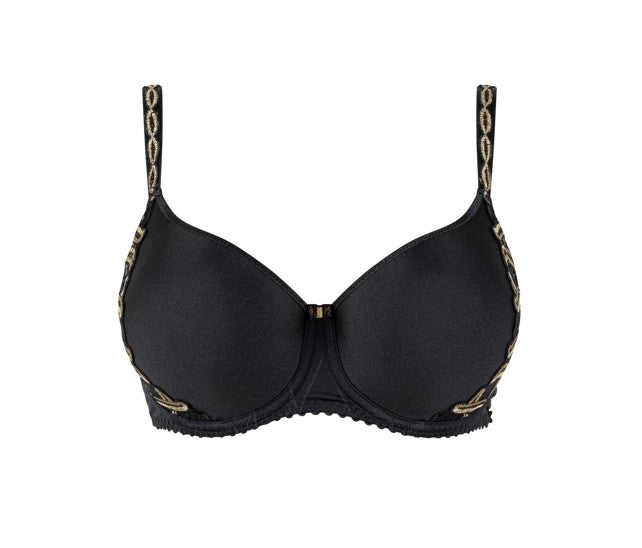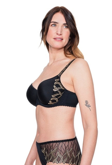 De Spacer bh uit de Julia lijn bevat borduursels met flamboyante verticale rondingen, die de rondingen van het vrouwelijk lichaam oproepen.